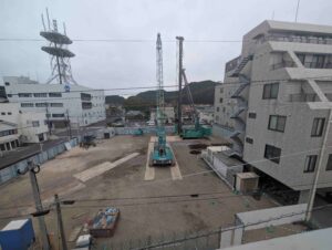 基礎の杭打ちが始まります。クレーンと杭打機の大きさに驚いています。